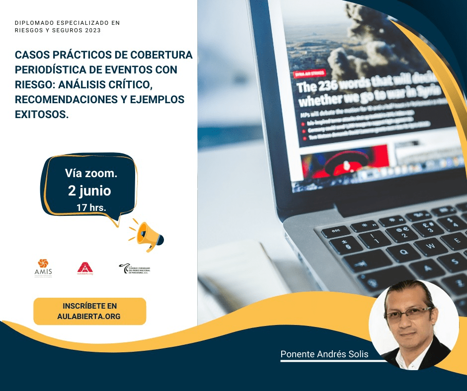 | Casos prácticos de cobertura periodística de eventos de riesgo: Análisis crítico, recomendaciones y ejemplos exitosos.La AMIS en alianza con el Consejo Ciudadano del Premio Nacional de Periodismo invitan a participar en la sesión Casos prácticos de cobertura periodística de eventos de riesgo: Análisis crítico, recomendaciones y ejemplos exitosos. Imparte Andrés Solis. Viernes 2 de junio, 17:00 horas. Informes e inscripciones en aulabierta.org |