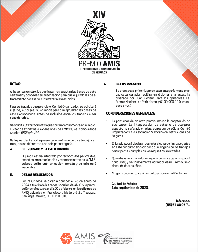 | AMIS lanza el XIV Premio AMIS de Periodismo y Comunicación en Seguros Podrán participar los trabajos en las categorías de medios impresos y digitales; creadores de contenido digital; opinión, ensayo o caricatura. La recepción de trabajos comenzará este 1 de septiembre y culminará el 15 de diciembre de 2023. Ciudad de México a 21 de septiembre de 2023.- La Asociación Mexicana de Instituciones de Seguros (AMIS) convoca a los periodistas y generadores de contenido a participar en el XIV Premio AMIS de Periodismo y Comunicación en Seguros. El objetivo del premio es reconocer la originalidad, nuevas formas de contar las historias — como el storytelling —o la creatividad y el humor para impulsar la cultura del seguro en México, por ello, los trabajos serán revisados por un Jurado Calificador. Las categorías en las que pueden participar son: Medios digitales e impresos: radio, televisión, periódicos, revistas, semanarios y portales. Creadores de contenidos digitales para nuevas audiencias: influencers, bloggers, vloggers. Opinión, ensayo y caricatura. El ganador de cada categoría recibirá un diploma; una estatuilla diseñada por el artista plástico Juan Soriano y 100 mil pesos. Los trabajos que pueden participar son los que hayan sido publicados en medios de circulación en México, escritos en español, entre el 1 de enero de 2023 y el 15 de diciembre de 2023. Entre los temas que se pueden abordar están el sector asegurador, los retos que enfrenta la cultura del seguro en el país, así como los beneficios que el seguro procura a la sociedad y a los individuos. Los trabajos postulados podrán enviarse a partir del 1 de septiembre y hasta el 15 de diciembre de 2023, a los correos: premioamisperiodismo@gmail.com Los resultados se darán a conocer el 26 de enero de 2024 a través de las redes sociales de AMIS, y la premiación se efectuará el día 20 de febrero en las oficinas de AMIS. Para revisar la convocatoria completa sólo entra a: Amis Prensa. https://sitio.amis.com.mx/ —ooOoo— Para más información, favor de contactar con: Alfonso Bonilla abonilla@amis.com.mx (55) 5480 0671 Verónica Galán vgalan@n.contactoenmedios.com 55 1081 4754 |
