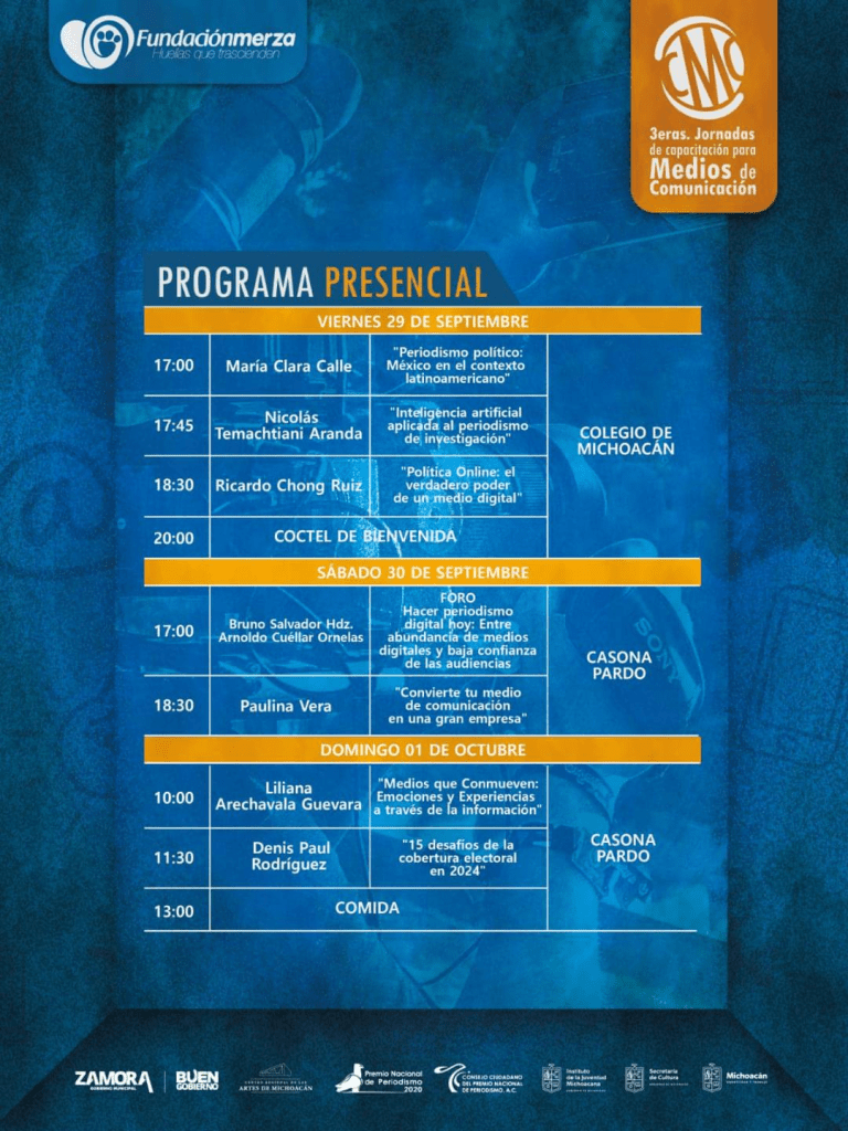 | Fundación Merza en alianza con el Consejo Ciudadano invitan a las «3ras. Jornadas de Capacitación para Medios de Comunicación». Del 29 de septiembre al 01 de octubre. Participan Bruno Hernández Levi – Presidente del Jurado del PNP2022, Arnoldo Cuellar Ornelas y Nicolás Aranda Álvarez -Ganadores del Premio Nacional de Periodismo. Registro en línea en https://shorturl.at/flwC7 o síguenos a través de las redes del Consejo en: YouTube https://bit.ly/3P7IeHE Twitter https://bit.ly/3qqYk5j Facebook https://bit.ly/3JdQ0hQ Instagram http://bitly.ws/GAnd Linkedin http://bitly.ws/GAnk |