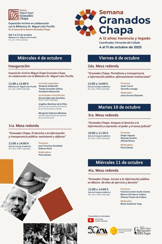 | La Universidad Autónoma Metropolitana Asociado CCPNP y la cátedra Miguel Ángel Granados Chapa invitan a las mesas redondas de la «semana Granados Chapa». Del 4 al 11 de octubre. Participan Jurado PNP: Juan Francisco Escobedo, Roberto Rock, Sergio Aguayo, Perla Gómez, además de, Francisco Javier Acuña Llamas – Comisionado INAI- y Blanca Lilia Ibarra Cadena – Presidenta Comisionada del INAI-. Transmisión en vivo a través de Youtube DCCD UAM – Unidad Cuajimalpa https://www.youtube.com/results?search_query=DCCD+UAM |