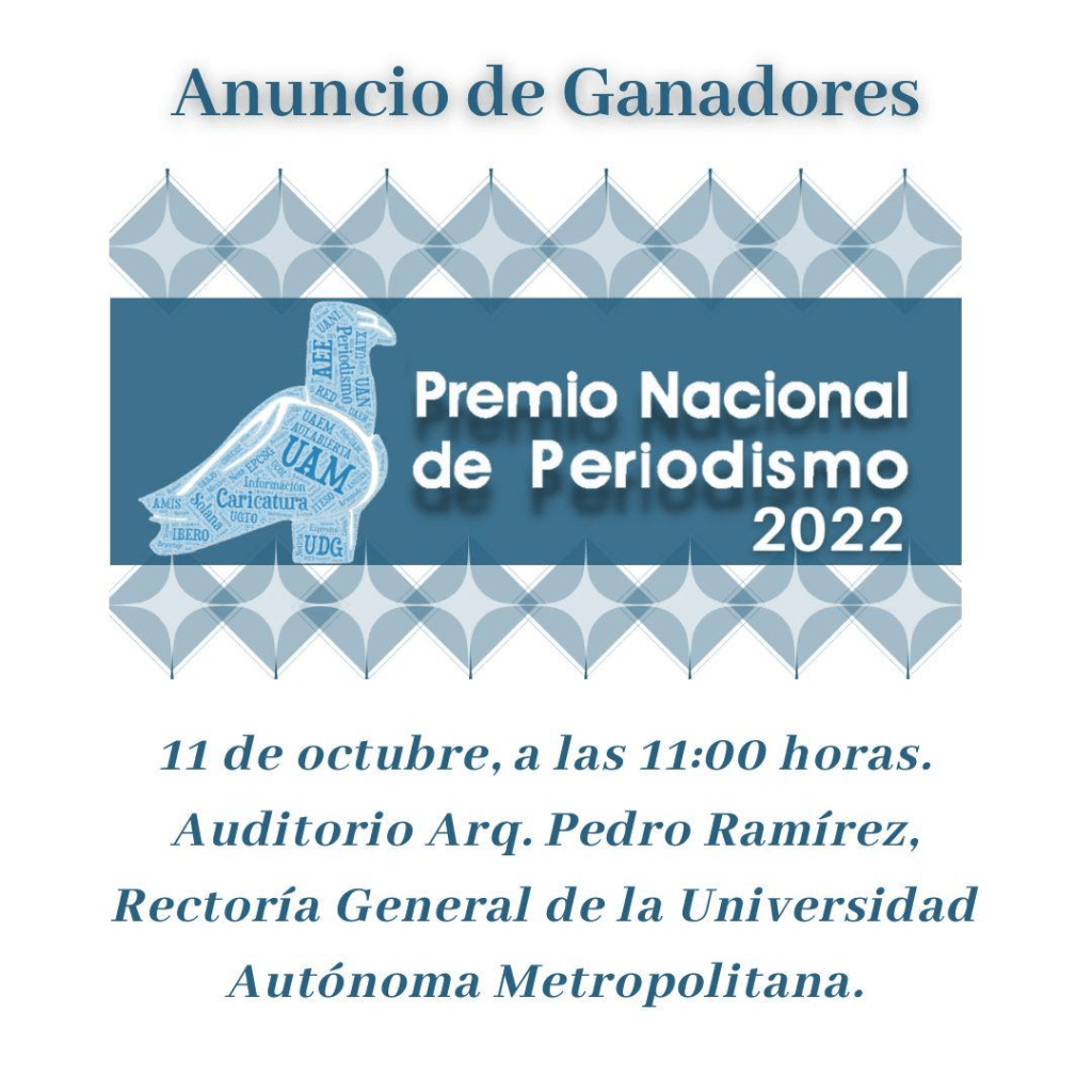 | Periodista falta poco para conocer a quienes obtendrán el reconocimiento a la excelencia periodística, a través del Premio Nacional de Periodismo 2022. La cita es el 11 de octubre, a las 11:00 horas en Auditorio Arq. Pedro Ramírez de la Rectoría General de la Universidad Autónoma Metropolitana Presidencia del CCPNP. |