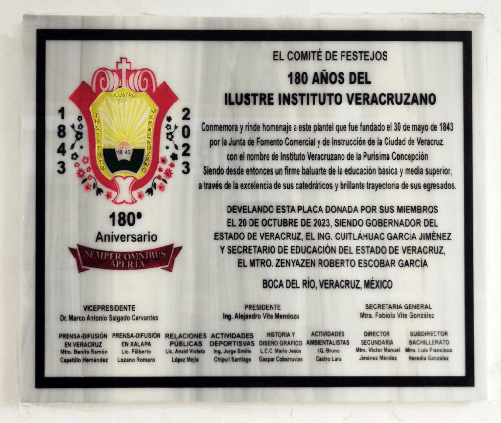 Conforme a su programa establecido para el jueves 14 de diciembre de 2023, a partir de las 10:00 AM se realizó la colocación de la placa que conmemora los 180 años de existencia del Ilustre Instituto Veracruzano a partir del 30 de mayo de 1843; en las instalaciones de Secundaria del mismo plantel situado sobre el bulevar Adolfo Ruíz Cortines en la ciudad de Boca del Río, Veracruz.