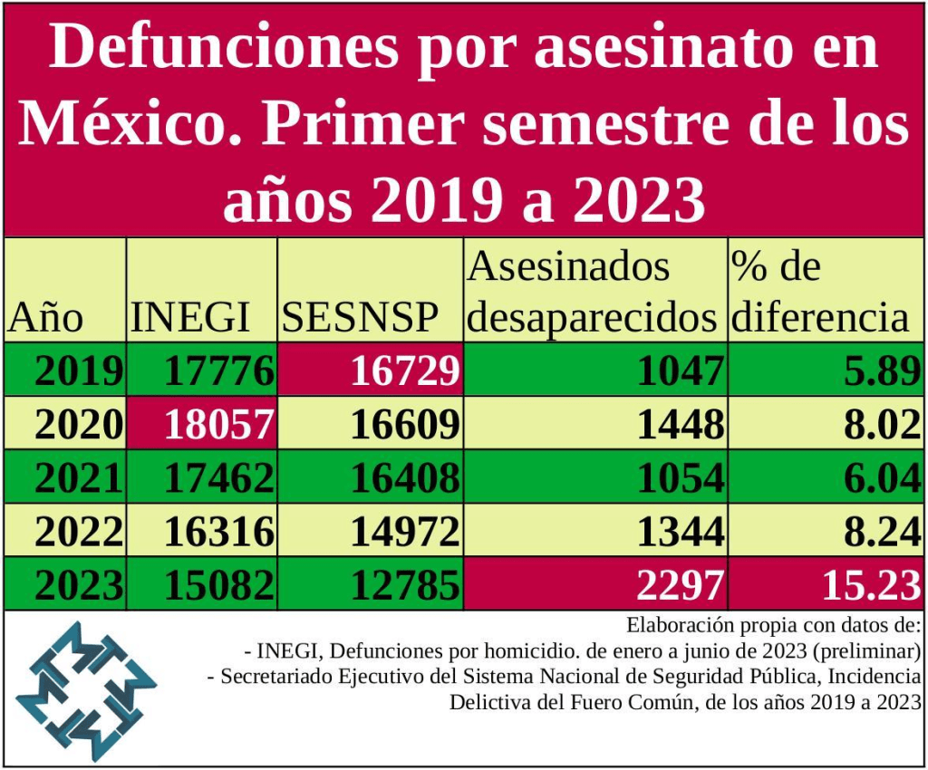 INEGI evidenció que durante el primer semestre de 2023 hubo, al menos, 2 mil 297 homicidios dolosos (que es como se le llama a los asesinatos formalmente) más que los registrados por el SESNSP.