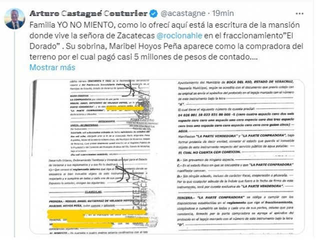 Por qué dicen que lo prometido es deuda, el empresario Arturo Castagné Couturier publicó en las redes sociales copia facsimilar de la escritura del terreno en la que está asentada la mansión en la que vive Rocío Nahle.