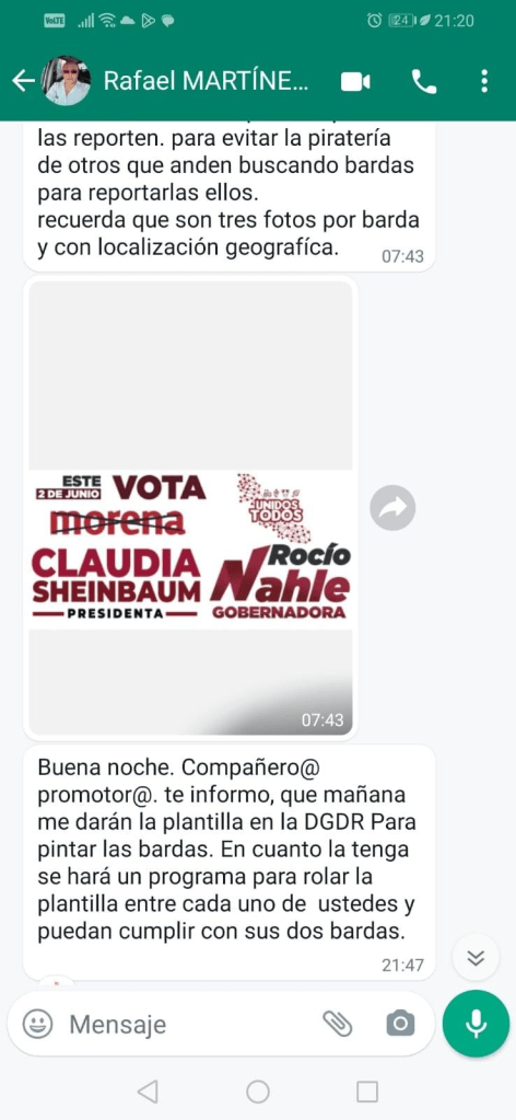 Rafael Martínez, de la misma DGDR, le envío un mensaje a los trabajadores anunciándoles que “mañana” le darían la “plantilla” para pintar bardas, en la misma DGDR y que “puedan cumplir con sus dos bardas”.