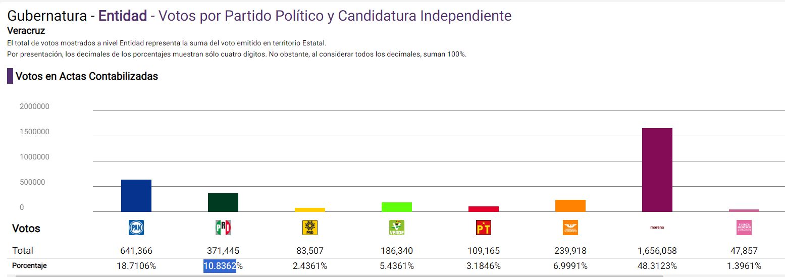 Por lo mismo, al no ser una votación similar para cada una, se toma como parámetro de medición los porcentajes de votación obtenidos y contabilizados por los órganos electorales, el Instituto Nacional Electoral, para los comicios federales (presidencia, senado y diputaciones federales), y el Organismo Público Local Electoral (OPLE) para las contiendas relativas a Veracruz, exclusivamente (gobierno de Veracruz y diputados locales).