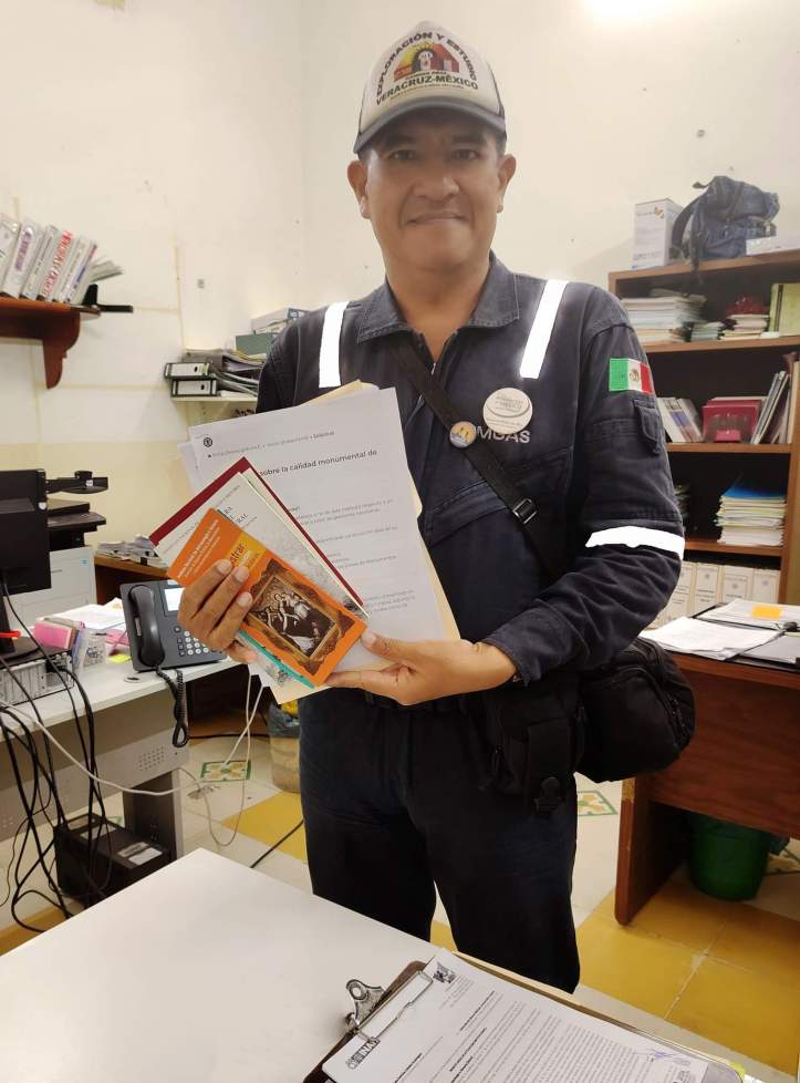 Durante el desarrollo de estas gestiones con el Instituto Nacional de Antropología e Historia (INAH), no dejamos de pasar al palacio municipal de Veracruz, para entregar los reconocimientos impresos que el 24 de septiembre se otorgaron no solo a las personas que participaron en hacer posible el diseño, contenido y montaje de la nueva placa informativa, sino también a la presidente municipal de Veracruz, Lic. Patricia Loveira Rodríguez y al Lic. Manuel Rivera Polanco, síndico único, quienes desde 2022 nos apoyaron para que el H. Ayuntamiento de Veracruz donará la placa diseñada por mi para el Torreón del Molino y en los elementos necesarios para el buen desarrollo del evento de su inauguración.
