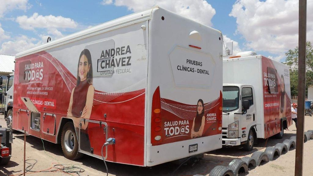 Estos contratos de salud itinerante, se cubrieron con el uso de camiones que -precisamente- son iguales a los que hoy trae Andrea Chávez en su campaña de salud y en los que está impreso su rostro.