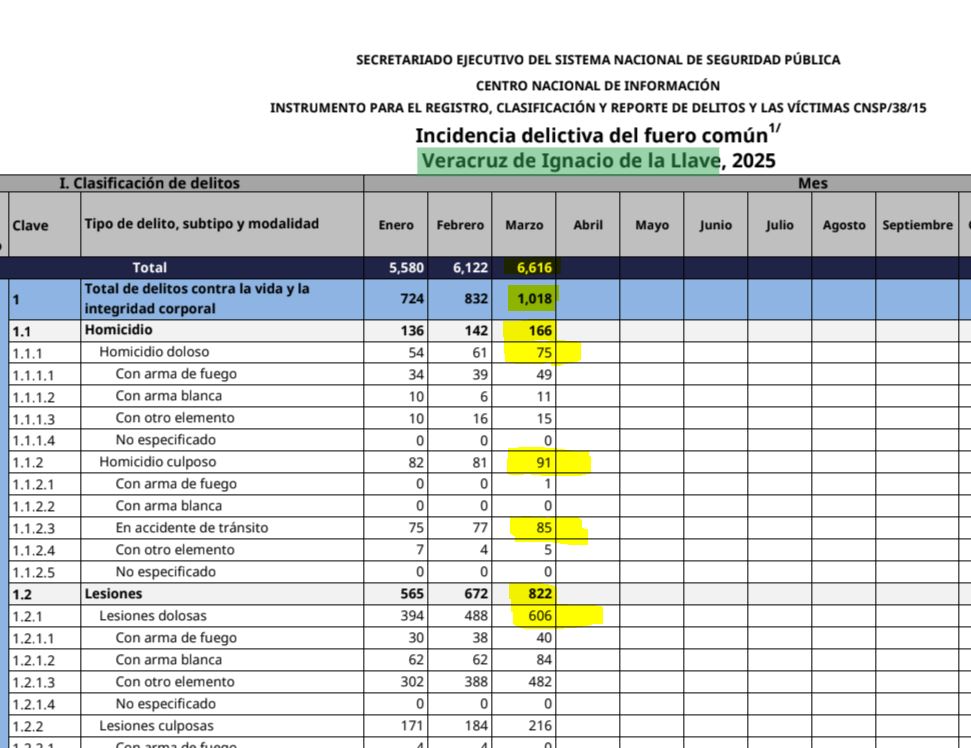 En lo correspondiente al homicidio doloso, marzo supera ampliamente a los meses anteriores del gobierno de Rocío Nahle, al llegar a la cifra de 75 muertes violentas reconocidas.