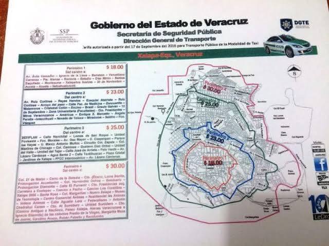 Si aplicáramos el supuesto cobro (Que debió haber pasado por un estudio de proyección finaciera de índice de inflación, costo de gasolina y herramientas, así como impacto económico en la población de Xalapa) según ya autorizado de tarifas de taxis según perimetraje por zonas pero convirtiéndolo a cobro por kilómetro alcanzados en la ruta contratada, entonces el cobro sería más justo y correspondiente a las siguientes tarifas. Aparentemen es casi lo mismo, pero la diferencia es que toma en cuenta zonas de ubicación geográfica de la ciudad sino kilómetros recorridos. No te cobrarían por el lugar donde haces la parada, sino por origen y destino de la ruta medido por kilometraje