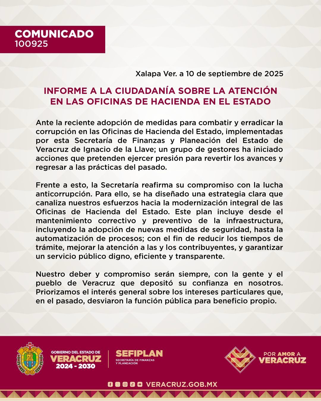 El texto oficial sentencia: “…la Secretaría reafirma su compromiso con la lucha anticorrupción. Para ello, se ha diseñado una estrategia clara que canaliza nuestros esfuerzo hacia la modernización integral de las Oficinas de Hacienda del Estado. Este plan incluye desde el mantenimiento correctivo y preventivo de la infraestructura, incluyendo la adopción de nuevas medidas de seguridad, hasta la automatización de procesos; con el fin de reducir los tiempos de trámite, mejorar la atención a las y los contribuyentes, y garantizar un servicio público digno, eficiente y transparente”.