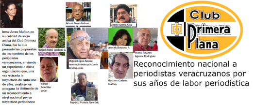 Entregará Club Primera Plana Reconocimientos a periodistas el próximo 27 de octubre, entre ellos estarán nuestros colegas: Marco Antonio Aguirre Rodríguez, Aracely Baizabal Andrade, Gustavo Cadena Mathey, Miguel Angel Cristiani, Cecilio García Cruz, Sergio González Levet, Miguel López Azuara (in memoriam), Ruperto Portela Alvarado y Arturo Reyes Isidoro