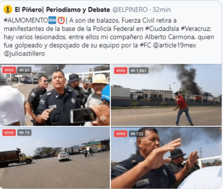 •Gobernador niega que Alberto Carmona haya sido agredido El gobernador de Veracruz, Cuitláhuac García, dijo que la Fuerza Civil sólo … Más